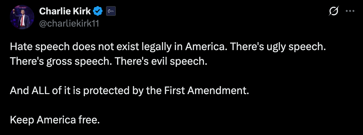 What’s worse, this is not an isolated incident, but part of an emerging pattern. Just this week on the Katie Miller podcast, U.S. Attorney General Pam Bondi suggested her office would target individuals for speech deemed hateful, saying, “There’s free speech and then there’s hate speech, and there is no place, especially now, especially after what happened to Charlie, in our society.”