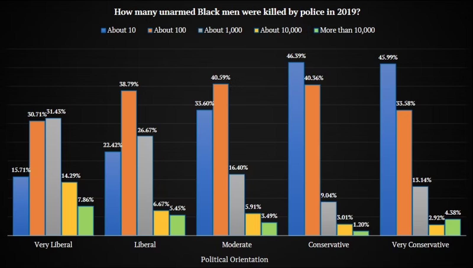 The actual number of unarmed black men killed that year was 11. In other words, regardless of political ideology, the majority of Americans exaggerate the scale of the problem by at least a factor of 10—and half of all liberals think 100 times more unarmed black men are killed by the police than actually are. I know these are abstract numbers, so think about it like this: you have $10,000 in the bank. I try to guess how much money you have. My guess is $1,000,000. That’s what’s happening here.